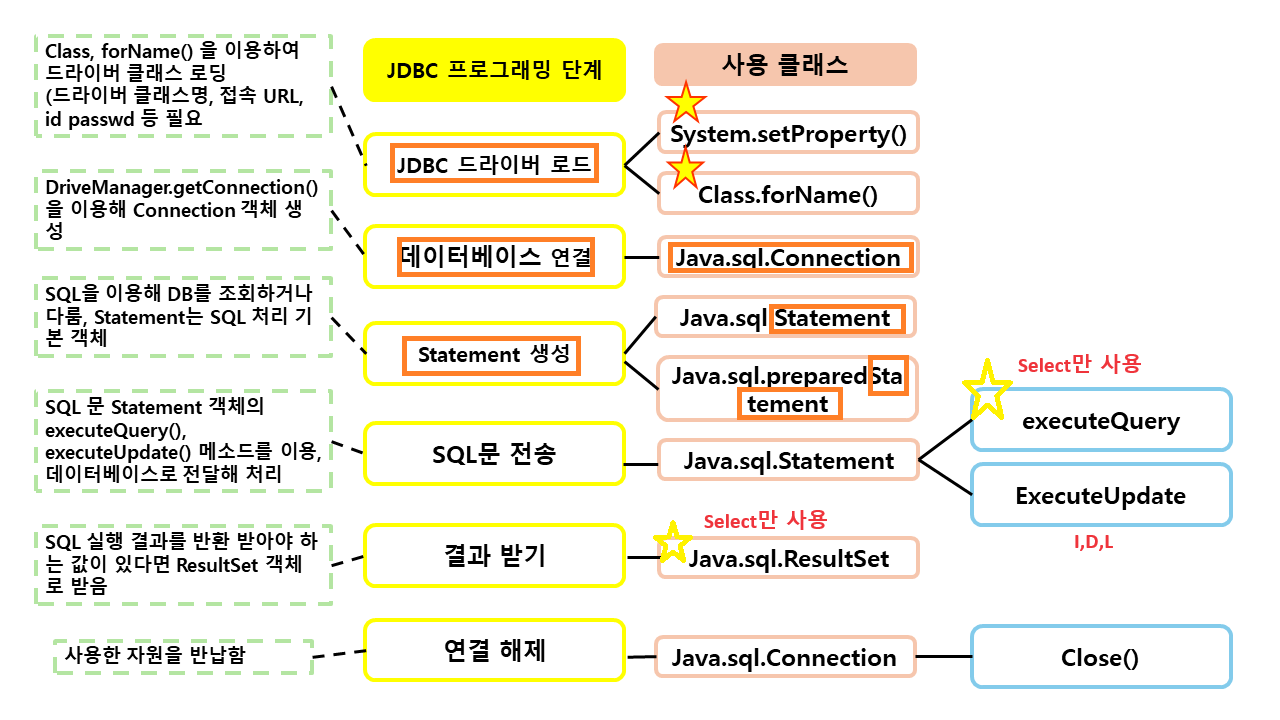 - 모든 작업이 끝나면 Statement 객체에서 close()메서드를 호출해서 데이터베이스와의 연결을 해제해야 함