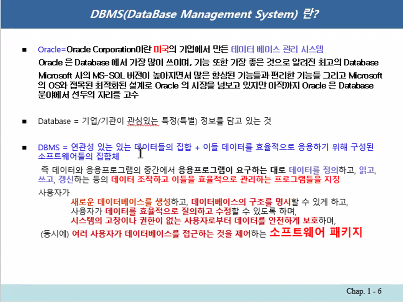 Microsoft사의 MS-SQL 버전이 높아지면서 향상된 많은 기능들과 편리한 기능들 그리고 Microsoft의 OS와 접목한 최적화된 설계로 Oracle의 시장을 넘보고 있지만, 아직까지 Oracle은 Datavase 분야에서 선두의 자리를 고수 - Database: 기업/기관이 관심 있는 특정(특별) 정보 담고 있는 것