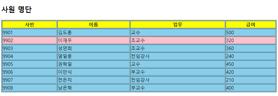 <th>사번</th><th>이름</th><th>업무</th><th>급여</th>