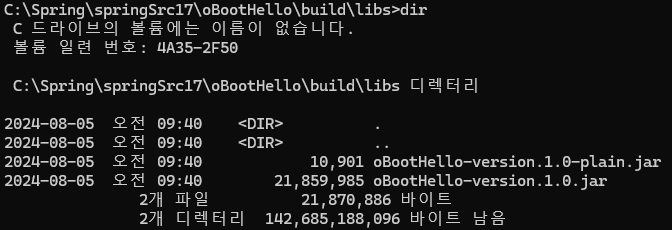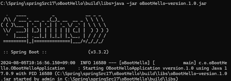 5.C:\Spring\springSrc17\oBootHello\build\libs 뒤에 java -jar oBootHello-version.1.0.jar(위에 나온 배포주소) 적용하여 만들기