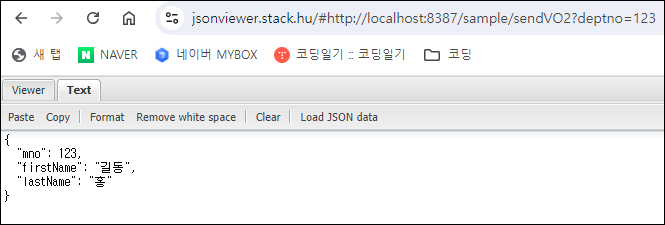 즉, 이 메서드가 실행되면 호출한 쪽에서는 SampleVO 객체를 받을 수 있으며, 그 객체에는 "길동", "홍", dept.getDeptno()에서 가져온 값이 각각 설정되어 있는 상태가 됨.