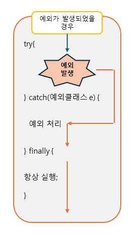 try-catch-finally 블록: 생성자 내부와 메소드 내부에서 작성되어 일반 예외와 실행 예외가 발생할 경우 예외 ㅊ리할 수 있도록 해줌