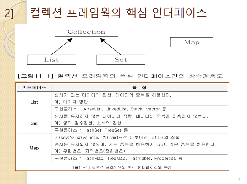 | 구현클래스: Arraylist(많이 쓰임), LinkedList, Stack, Vector 등 | |
